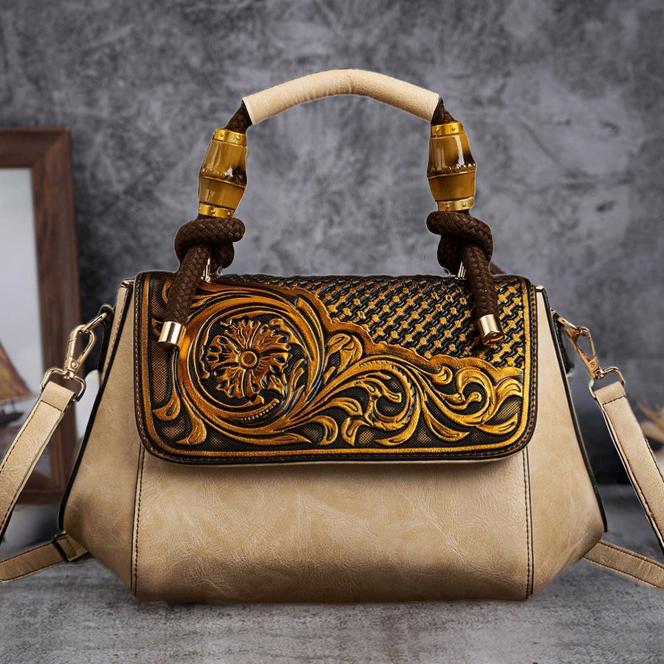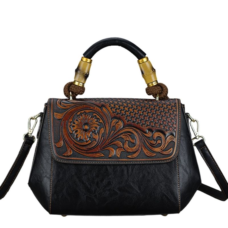 These elegant handbags feature intricate floral embossing, offering a touch of vintage charm. Available in rich brown, sleek black, deep green, and classic beige, they suit various styles. The sturdy top handle with metallic accents adds sophistication and durability. Perfect for sophisticated daily wear or special occasions.